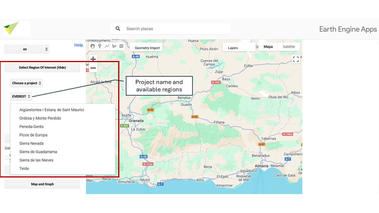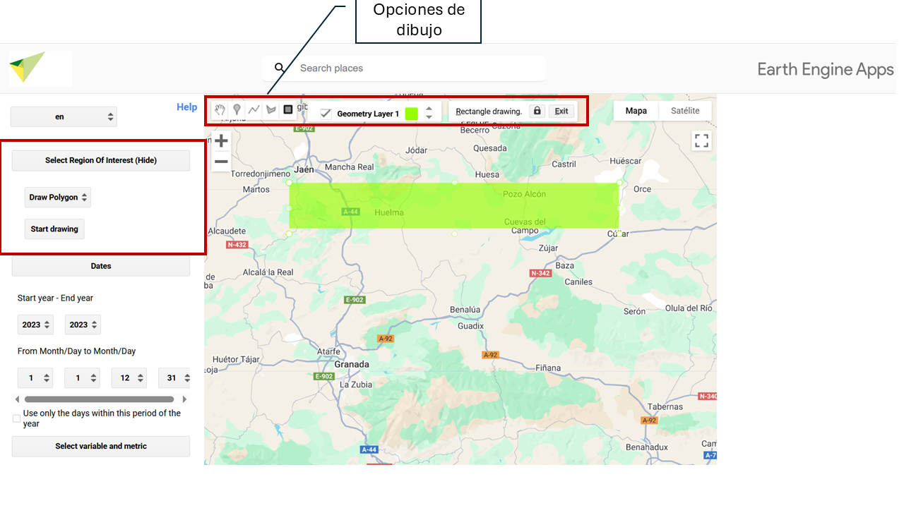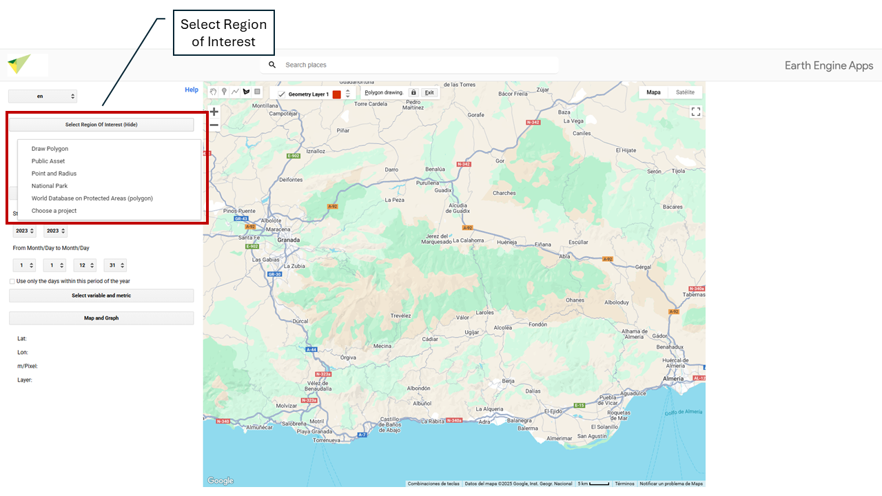 In this section you can define the Region of Interest (ROI) on which the analysis will be carried out. Several options are available for selecting or uploading your study area. By default, the tool is set to draw custom polygons. To change the type of geometry (for example, to point or rectangle), go to the drawing options menu before defining the region of interest.