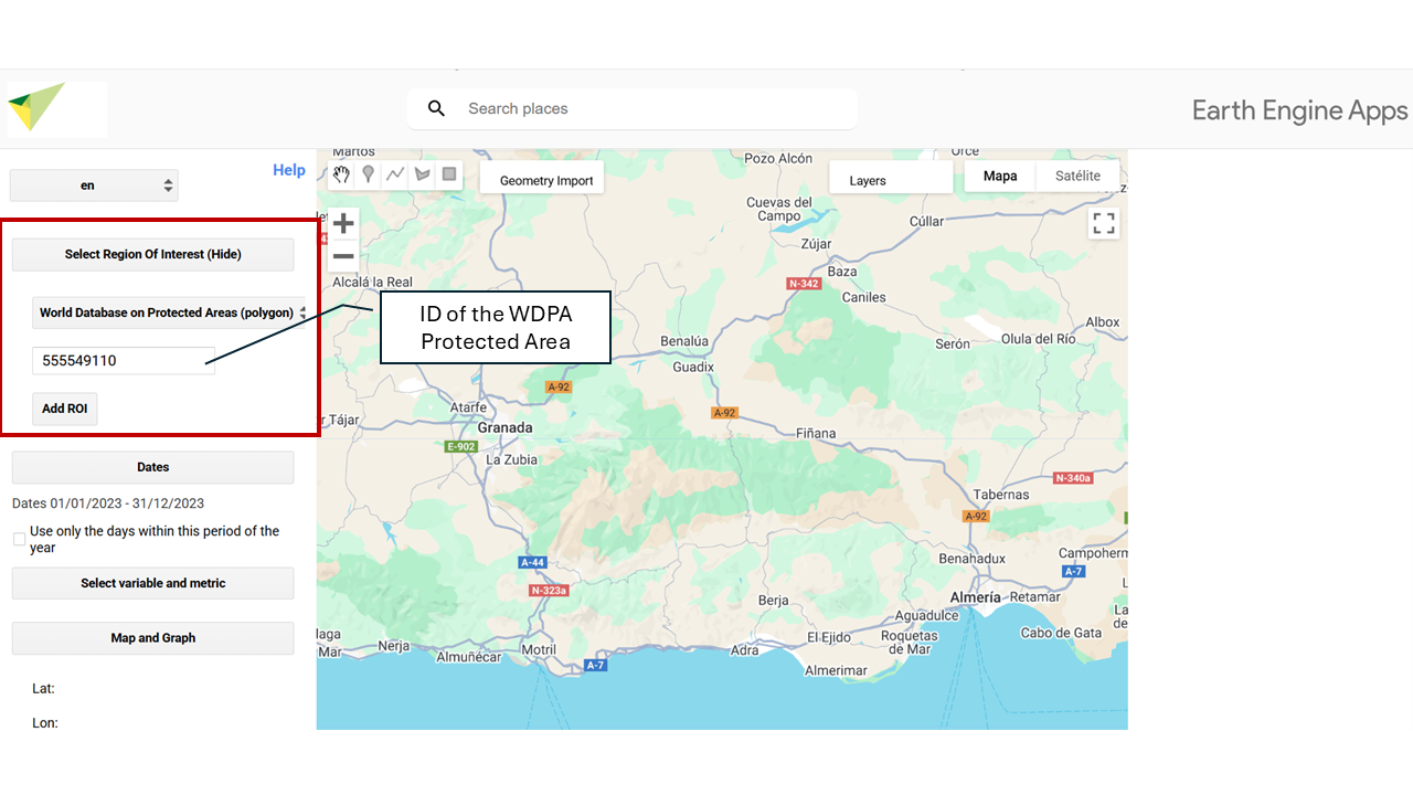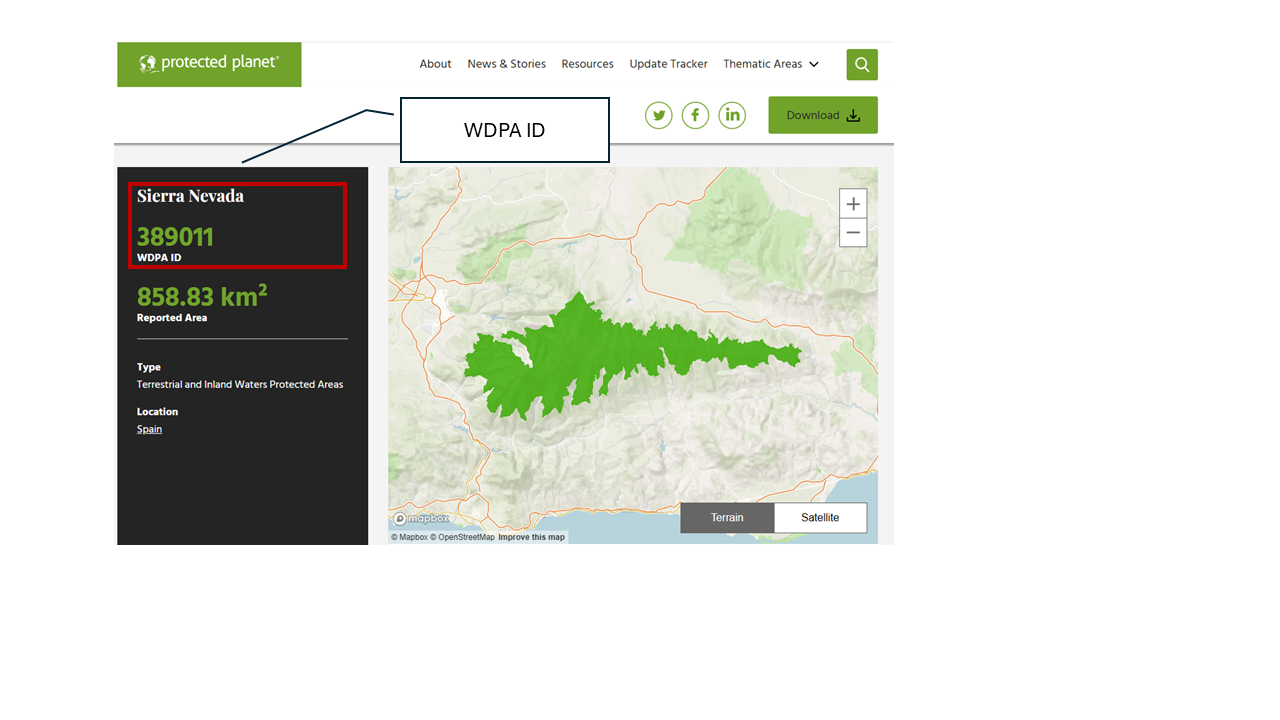 To select a protected area by its ID, you can access the database through the official Protected Planet website (π protectedplanet.net). There, you can search protected areas by name, country, or protection category and obtain their unique identifier (WDPA ID).