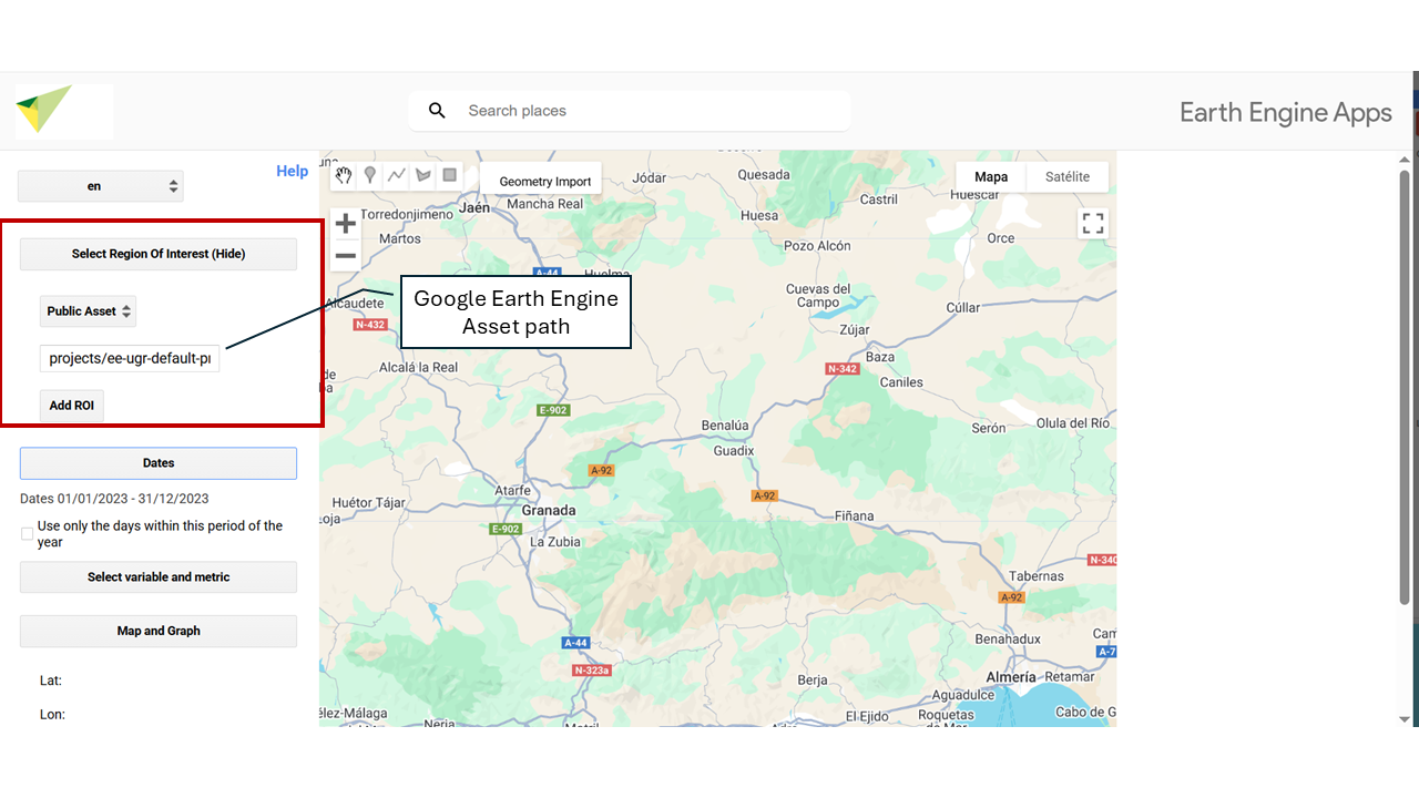 Next, exit GEE and return to the MonitorEO app. There, indicate the asset path, i.e., the unique address where the resource is stored within your GEE account.