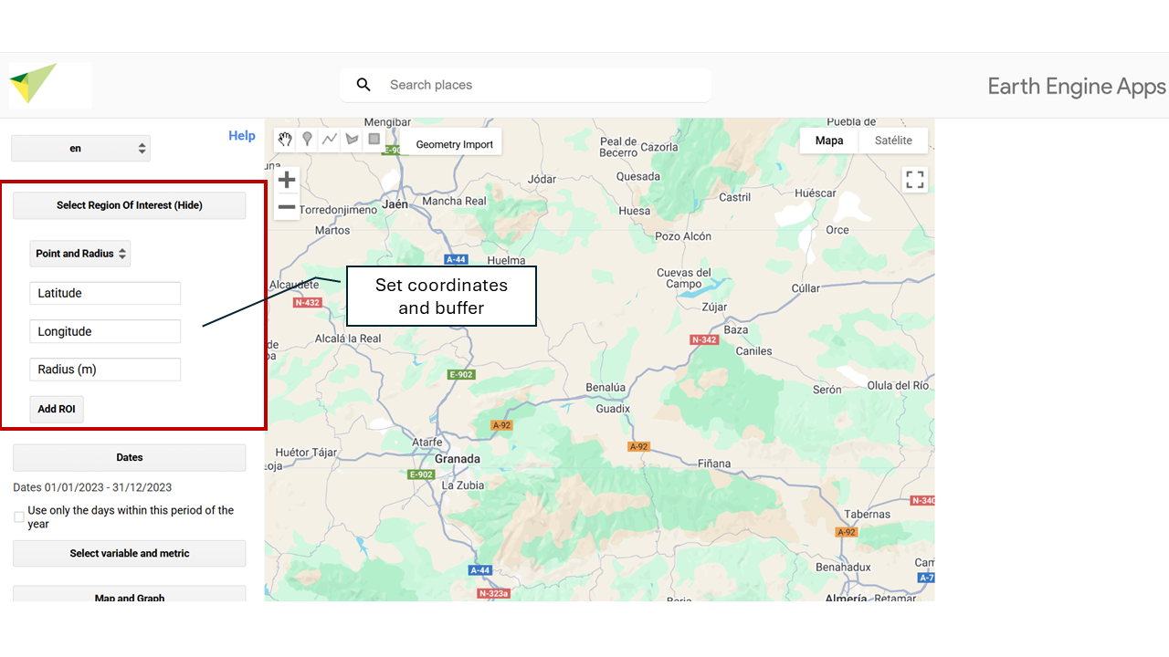 You can enter latitude and longitude coordinates to define an exact location on Earthβs surface. From that point, a circular area (buffer) can be generated whose radius, in meters, is defined by the user. This functionality allows you to delimit areas of interest around a specific point for analysis.