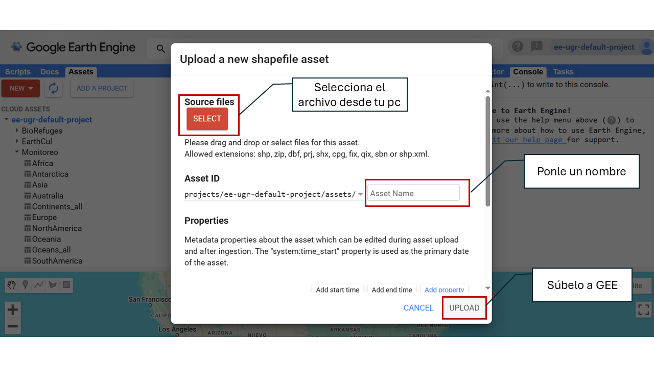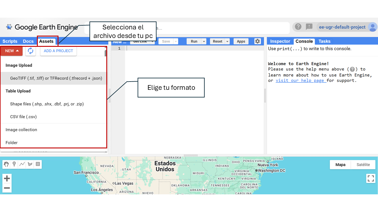 Once your account is active, you will be able to upload your own spatial data to GEE by following these steps: