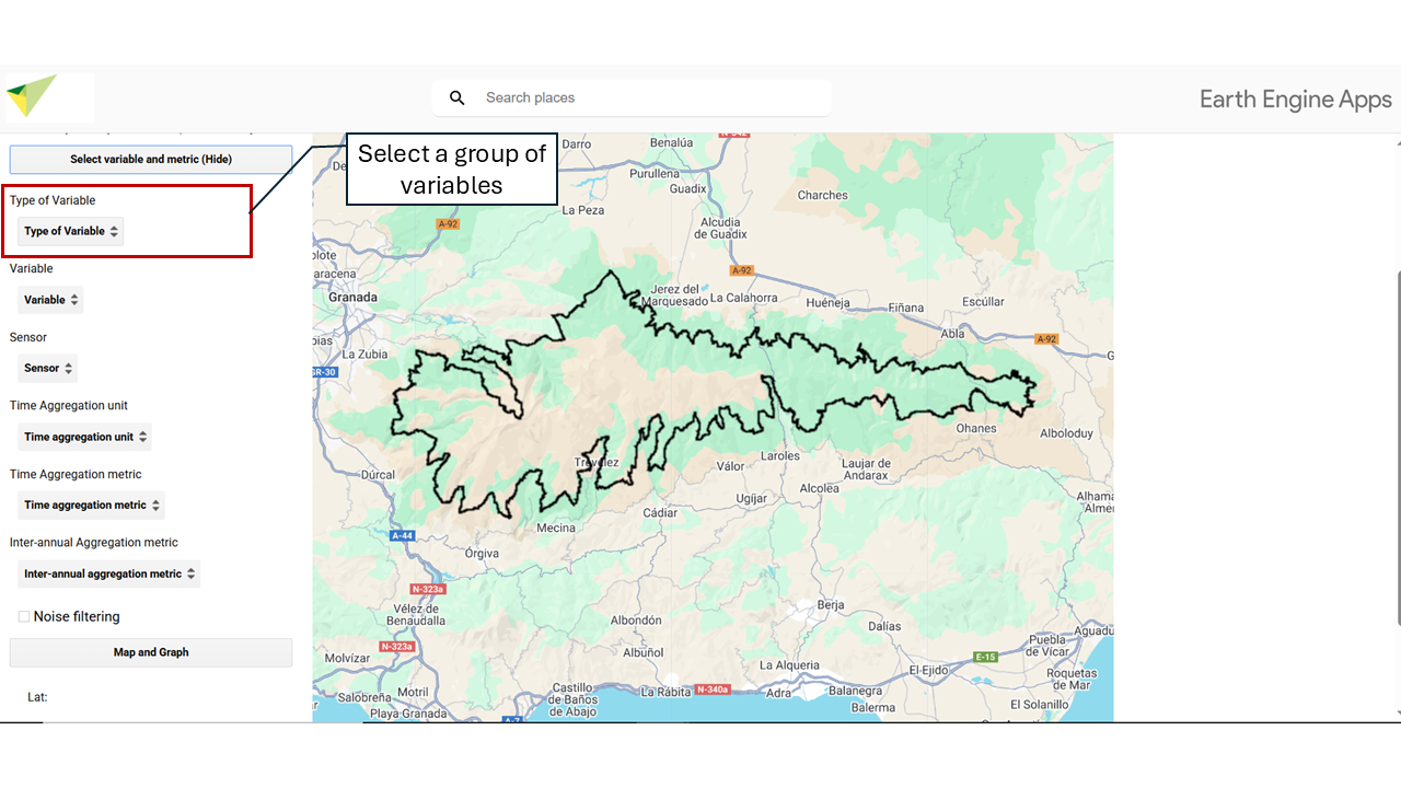 Select the study variable. The variables are classified into major categories of EBVs {target=_blank} (Essential Biodiversity Variables), related to ecosystem functioning and structure. MonitorEO-OBSNEV includes: