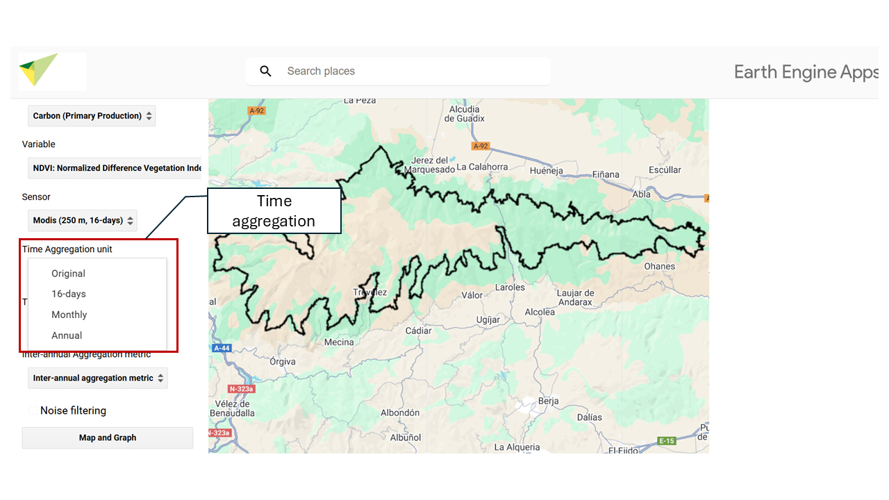 Select the temporal interval over which you want to perform the calculations. You can keep the original temporal resolution of the sensor or apply a periodic aggregation to facilitate the analysis: